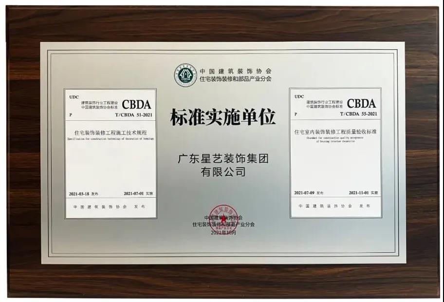 廣東星藝裝飾集團(tuán)入選建筑裝飾行業(yè)工程建設(shè)CBDA標(biāo)準(zhǔn)《住宅裝飾裝修工程施工技術(shù)規(guī)程》、CBDA標(biāo)準(zhǔn)《住宅室內(nèi)裝飾裝修工程質(zhì)量驗收標(biāo)準(zhǔn)》標(biāo)準(zhǔn)實施單位