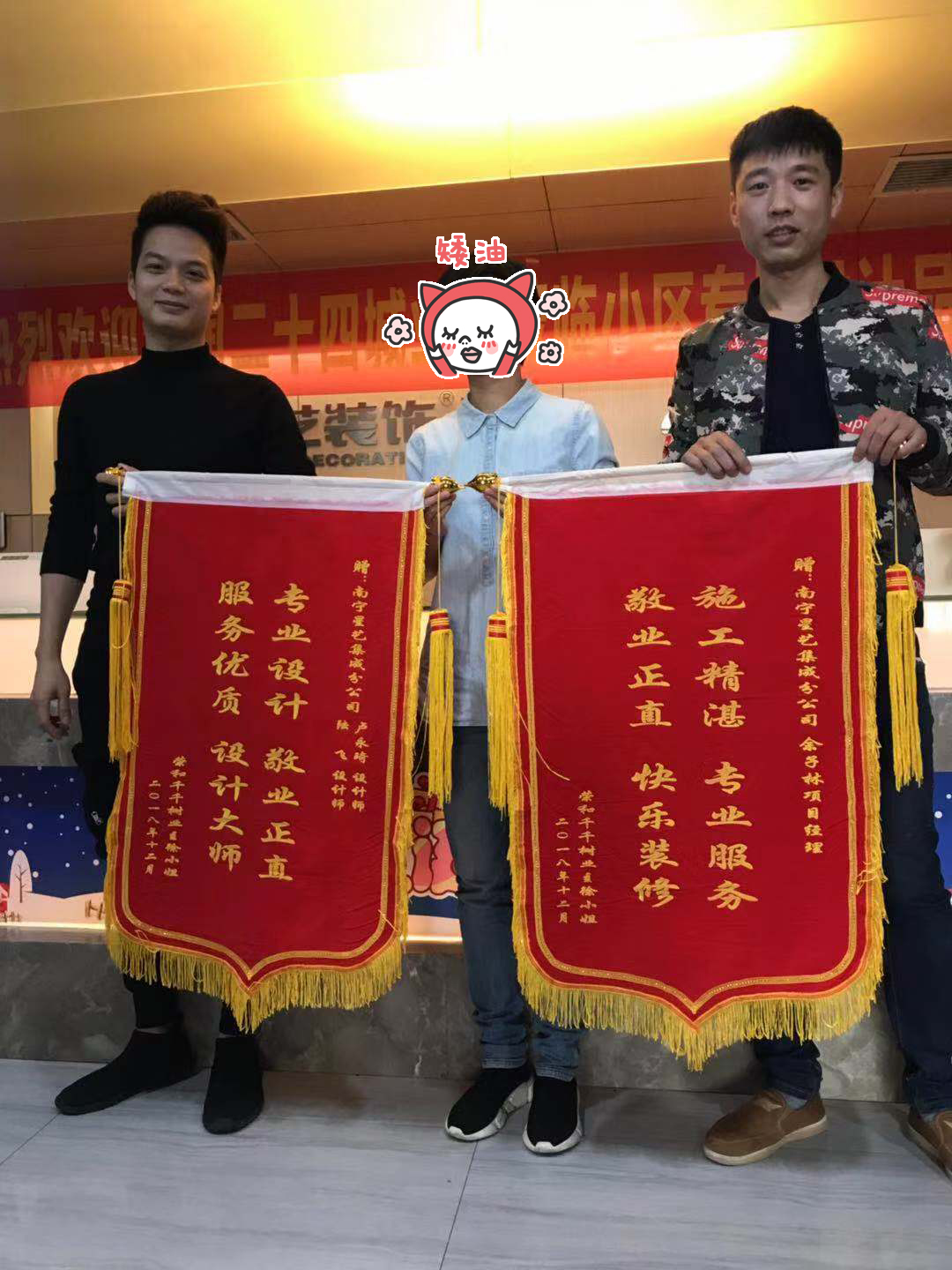 2018年12月21日,榮和千千樹業(yè)主送來錦旗,稱贊設(shè)計師陸飛、盧永琦專業(yè)設(shè)計,敬業(yè)正直,服務(wù)優(yōu)質(zhì),設(shè)計大師;監(jiān)理余子林施工精湛,專業(yè)服務(wù),敬業(yè)正直,快樂裝修。南寧星藝裝飾全員會繼續(xù)以虔誠、熱情、體貼的態(tài)度和更加務(wù)實、求精、利他的行動,將“讓每一位客戶滿意”的服務(wù)標(biāo)桿,提升到“讓每一位客戶感動”的新高度,讓客戶省心、省時、省力!