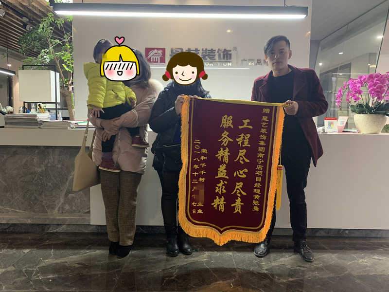 2019年1月22日,星藝裝飾南寧公司項目經(jīng)理黃張勇接受到榮和千千樹業(yè)主業(yè)主的表彰錦旗! 這不是星藝裝飾的第一面錦旗,但也肯定不是最后一面錦旗,紅艷艷的錦旗是星藝裝飾始終堅持顧客至上的服務理念的最好的回報,也是公司不斷發(fā)展、不斷壯大的強勁動力。我們將繼續(xù)堅持“把裝修交給我們,您放心上班去”的宗旨,全心全意為每一位客戶服務,打造出更多的“放心工程”、“品質(zhì)工程”,來回報我們的客戶。
