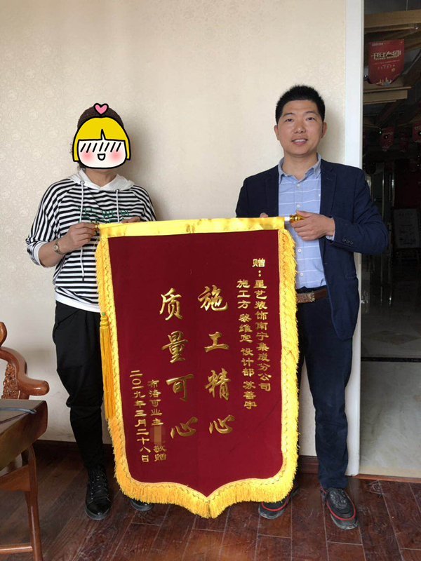 2019年3月28日,嘉和城布洛克業(yè)主為感謝項目經(jīng)理黎維定和設計師蘇善宇,專門贈送錦旗,錦旗內(nèi)容:質(zhì)量可心 施工精心 。星藝一直堅持做裝修等于做朋友的理念,不斷地從設計、材料、工程及管理方面進行創(chuàng)新、優(yōu)化,走在家裝行業(yè)的前列。