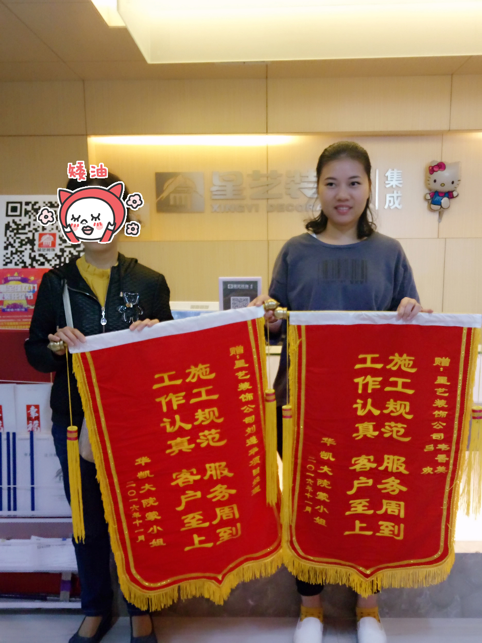 2016年12月6日送來錦旗,贊揚(yáng)星藝裝飾工作認(rèn)真負(fù)責(zé),施工規(guī)范,客戶至上,服務(wù)周到,設(shè)計(jì)師韋香美接受錦旗