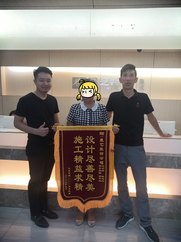 金口碑銀口碑不如業(yè)主的好口碑,獲得客戶的認可是所有裝飾企業(yè)的共同目標。2019年國慶前夕,天譽花園業(yè)主以一面錦旗表達了他對星藝裝飾誠摯的謝意。設(shè)計師 陳忠波 項目經(jīng)理周平亮接受錦旗