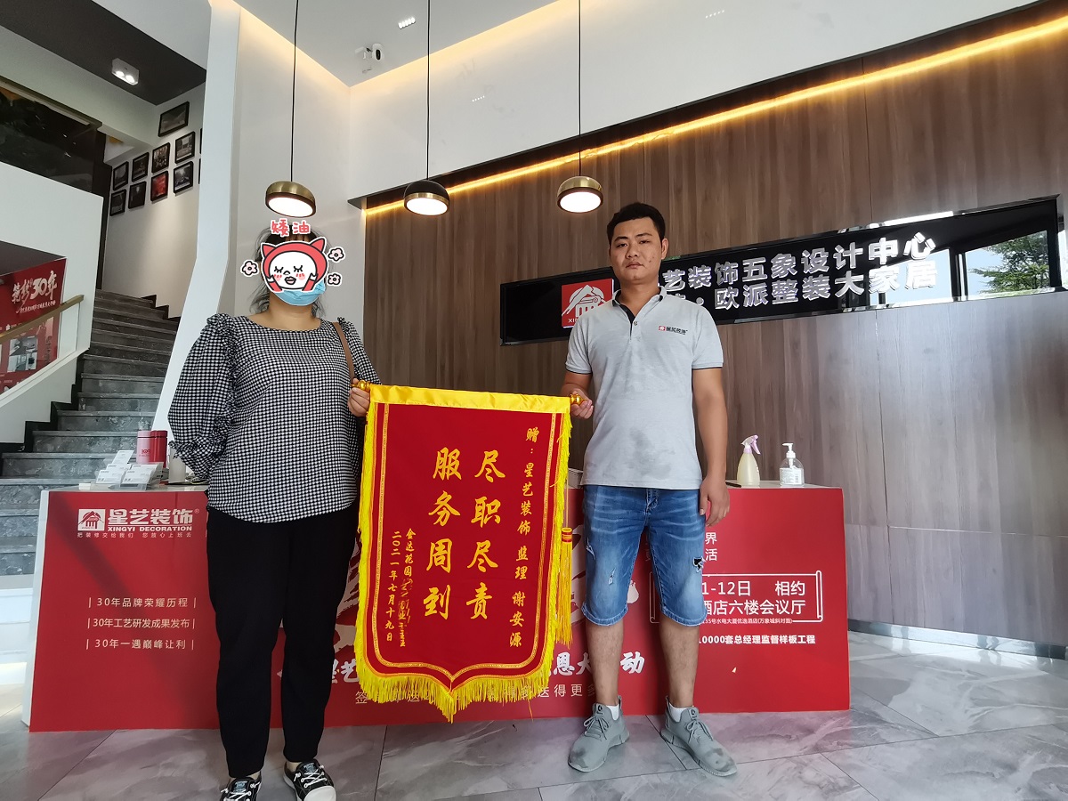 業(yè)主將大紅錦旗送到星藝裝飾五象設(shè)計中心,以感謝星藝裝飾工程監(jiān)理謝安源盡職盡責(zé),服務(wù)周到 ,這是對我們工作的極大認(rèn)可和肯定。在今后的工作中,我們將再接再厲,堅持做客戶口碑,打造出更多的“精品工程”、“放心工程”,來回報我們的客戶。