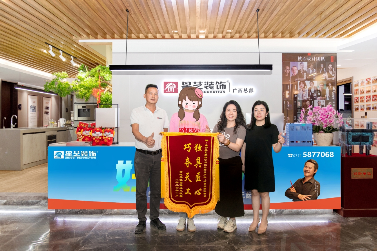 今日,星藝裝飾廣西總部迎來(lái)了一段溫馨而榮耀的時(shí)刻。金地美域國(guó)際小區(qū)的一位業(yè)主特地送來(lái)了一幅錦旗,以表彰我們團(tuán)隊(duì)在裝修項(xiàng)目中的卓越表現(xiàn)。這幅錦旗上題寫(xiě)著“巧奪天工 獨(dú)具匠心”,表達(dá)了業(yè)主對(duì)我們工作的高度認(rèn)可和由衷感謝。設(shè)計(jì)師甘盧華和項(xiàng)目經(jīng)理陳希明與業(yè)主共同合影留念,記錄下了這一珍貴的瞬間。