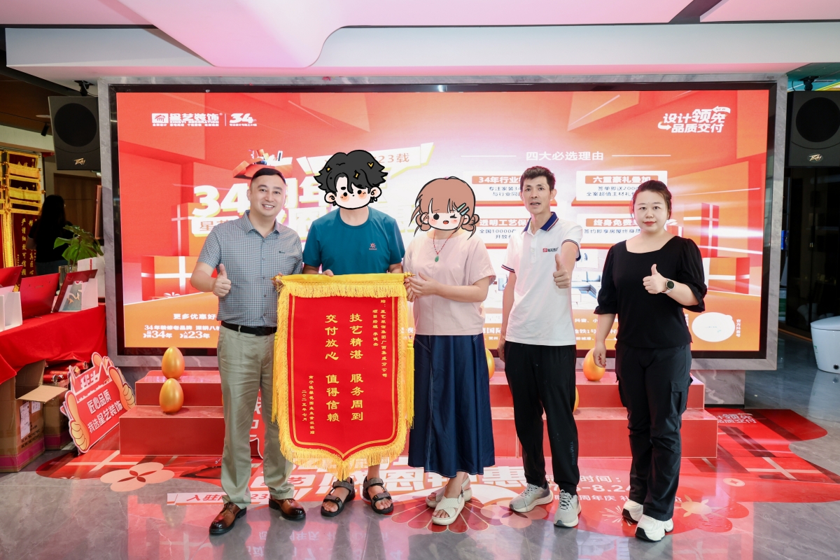 在溫馨的氛圍中,董女士與負責其項目的設計師王晶、全程把控的項目經(jīng)理李建杰,以及集成整裝館總經(jīng)理胡四民一起,親切合影留念。這珍貴的瞬間,不僅記錄了一份沉甸甸的信任,也充分展現(xiàn)了南寧星藝裝飾團隊以客戶為中心、追求卓越品質的服務理念。