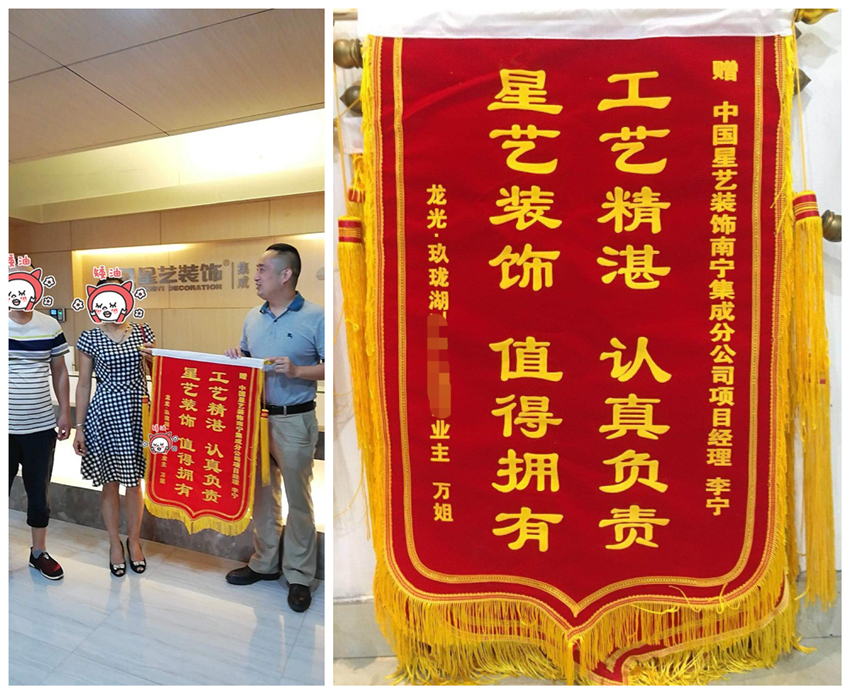 2018年9.月9日,龍光玖瓏湖業(yè)主送來錦旗,稱贊星藝裝飾項目經(jīng)理李寧,工藝精湛,認(rèn)真負(fù)責(zé),星藝裝飾,值得擁有