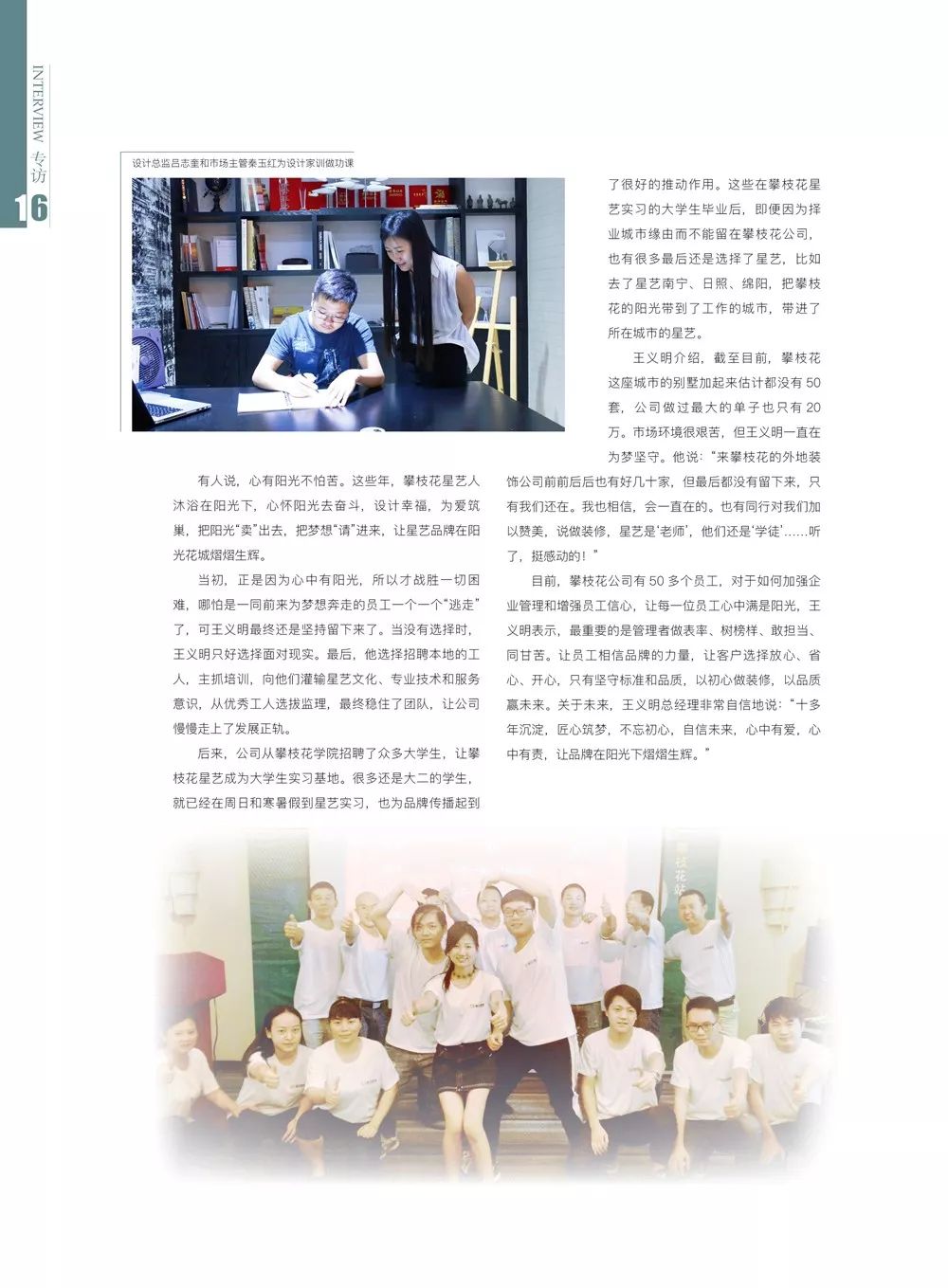 王義明一直在為夢堅守。他說:“來攀枝花的外地裝飾公司前前后后也有好幾十家,但最后都沒有留下來,只有我們還在。我也相信,會一直在的。也有同行對我們加以贊美,說做裝修,星藝是‘老師’,他們還是‘學徒’……聽了,挺感動的!”