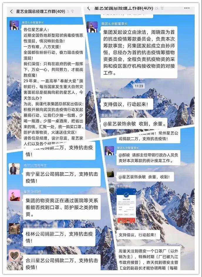 南寧星藝裝飾立刻積極響應新型冠狀病毒疫情及防控要求,自覺肩負起社會責任,與國家一起共克艱難,在總部領導們的帶領下為武漢共獻大愛,支援武漢,并攜手客戶、歐派集團舉行團購義捐,將每份“愛心接龍”落到實處,踐行奉獻大愛的星藝企業(yè)文化理念。