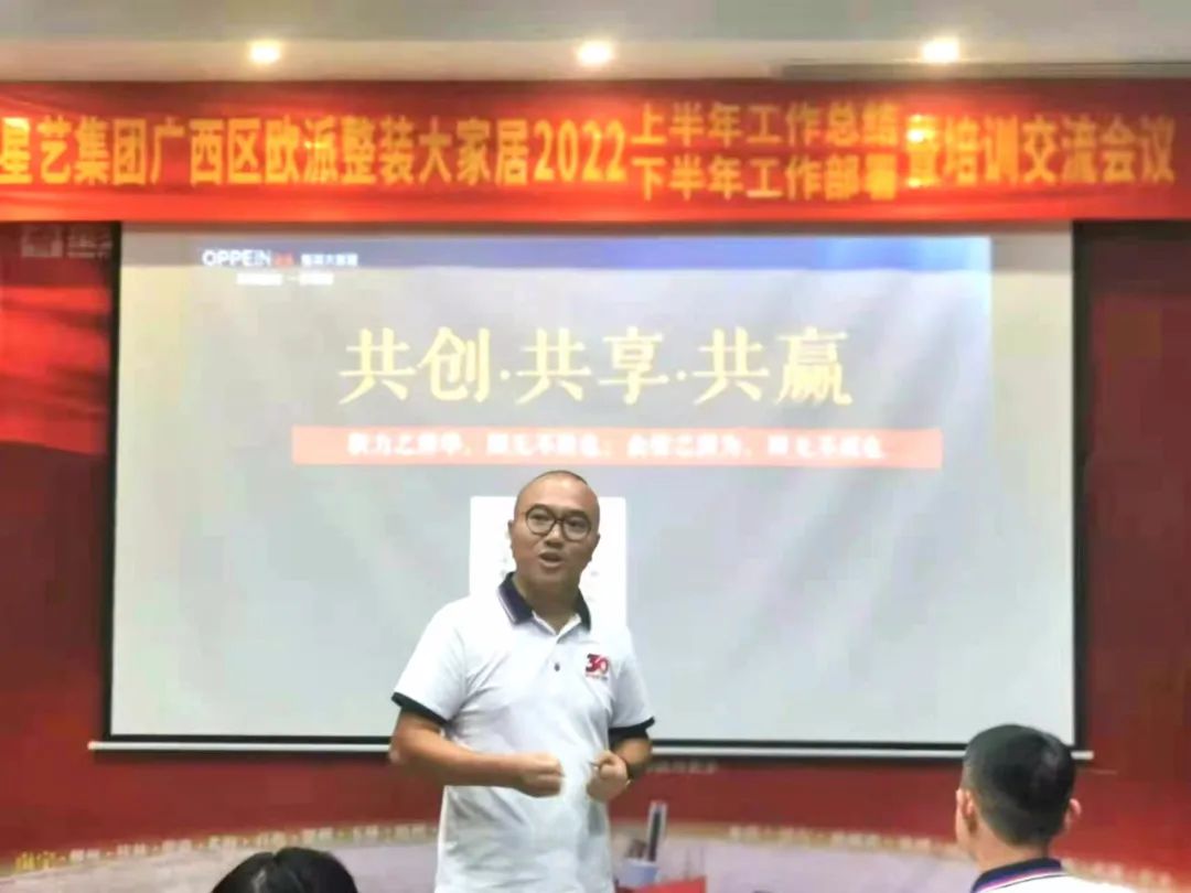 在星藝&歐派整裝大家居(南寧)即將完美蛻變之際,8月8日,星藝&歐派2022年上半年總結(jié)、下半年工作部署暨培訓(xùn)交流會在星藝廣西總部會議室隆重舉行,星藝集團決策委成員、廣西區(qū)域設(shè)計總監(jiān)徐橘、星藝南寧區(qū)域總經(jīng)理周平生、星藝南寧區(qū)域設(shè)計總監(jiān)李明以及歐派大區(qū)經(jīng)理鄧磊、片區(qū)經(jīng)理周長清等領(lǐng)導(dǎo)共同出席了本次培訓(xùn)交流會。