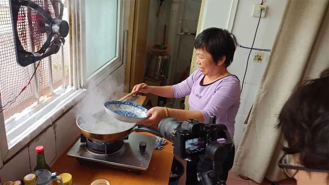 上午9時(shí)許,食堂內(nèi)就已經(jīng)很忙碌,各種備菜擺滿柜臺(tái),10時(shí)50分前就要出餐。臨近中午,二樓以上的煙火味漸濃。走廊上,星藝家人趁著日光尚好,在護(hù)欄上曬白菜,即將腌酸做成美味;廚房里,一名星藝員工家屬正在炒菜,魚(yú)味辣香頗有老家江西味道;公寓拐角的休閑區(qū),身著工服的星藝人與剛學(xué)會(huì)走路的孩子逗趣,教“星二代”如何敬禮。