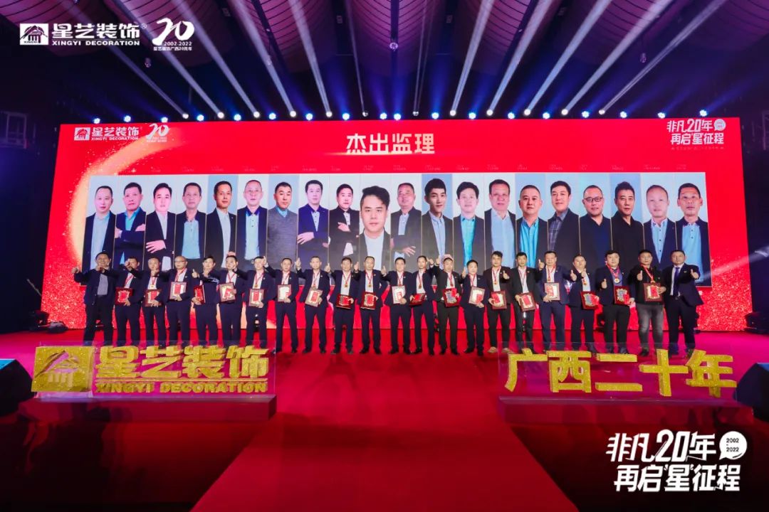 在慶典上,星藝裝飾進駐南寧20周年特設(shè)“二十周年最佳金融合作伙伴”“優(yōu)秀合作品牌”“星藝廣西區(qū)域杰出單位”“杰出員工”等十一個獎項,表彰為星藝南寧作出突出貢獻,取得優(yōu)異成績的團隊和個人。現(xiàn)場對10名“優(yōu)秀之星”,9名“優(yōu)秀員工”,17名“優(yōu)秀管理人員”,20名“杰出工人師傅”,11名“杰出營銷”,20名“杰出監(jiān)理”,16名“杰出設(shè)計師”,8名“杰出管理人員”,8家“優(yōu)秀合作品牌”,5家“最佳金融合作伙伴”以及10家“杰出單位”頒獎。