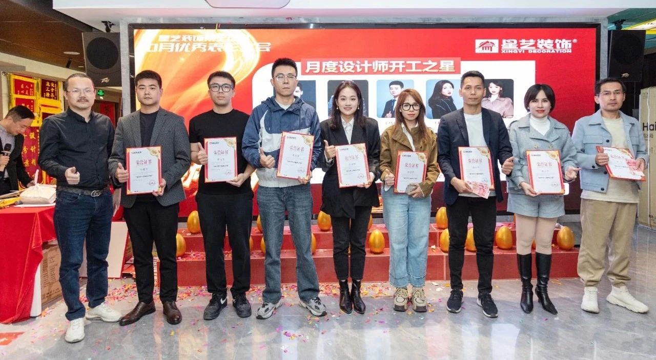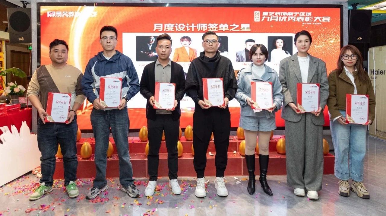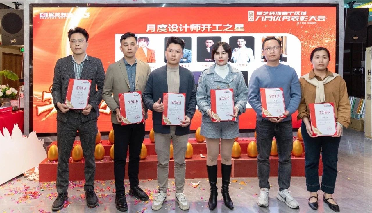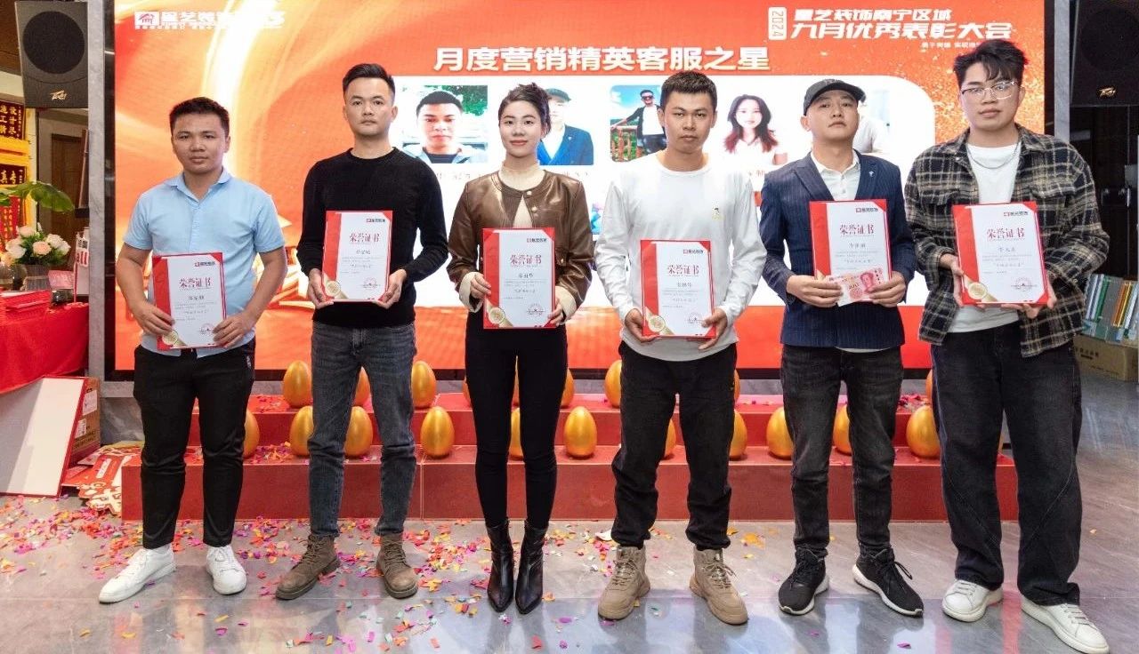 會議開始,星藝南寧區(qū)域總經(jīng)理周平生、星藝南寧區(qū)域設(shè)計總監(jiān)李明以及星藝南寧區(qū)域副總經(jīng)理胡四民率先為9月份、10月份表現(xiàn)優(yōu)異的星藝團隊及家人頒發(fā)月度獎勵以及證書,并號召現(xiàn)場星藝家人向優(yōu)秀看齊。