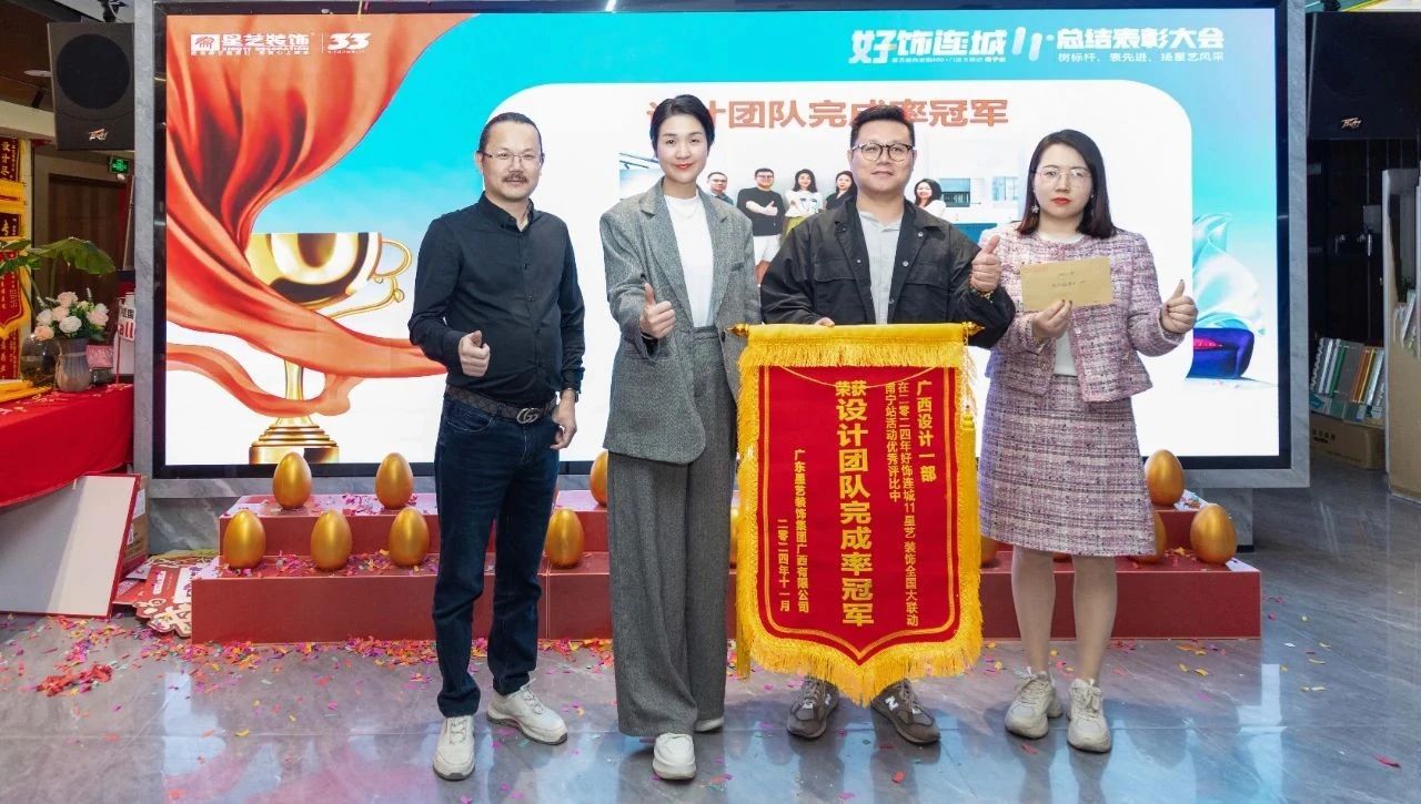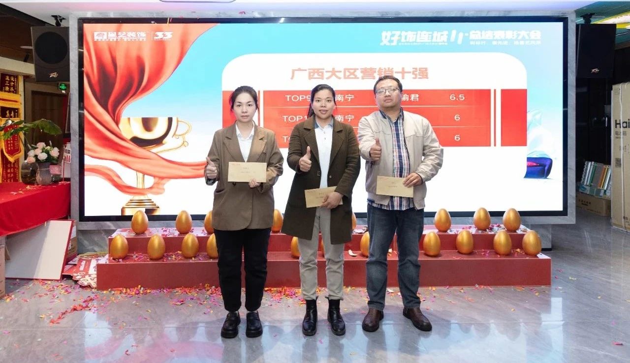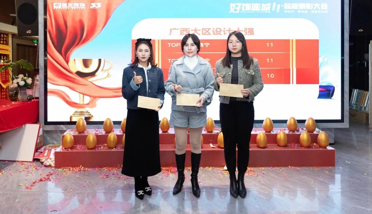 緊接著,大會進入“好飾連城11(南寧站)”總結(jié)表彰環(huán)節(jié),在此次活動中,經(jīng)過星藝家人們的共同努力,創(chuàng)下獲508戶業(yè)主選擇的歷史佳績新高,再度彰顯星藝裝飾創(chuàng)立33年的品牌魅力;其中涌現(xiàn)出了許多優(yōu)秀的團隊及個人,他們齊心奮進,勇創(chuàng)佳績,為其他星藝家人樹立標桿,樹立“星”榜樣;會議現(xiàn)場,周總、李工、胡總也分別為其頒發(fā)活動獎勵及證書。