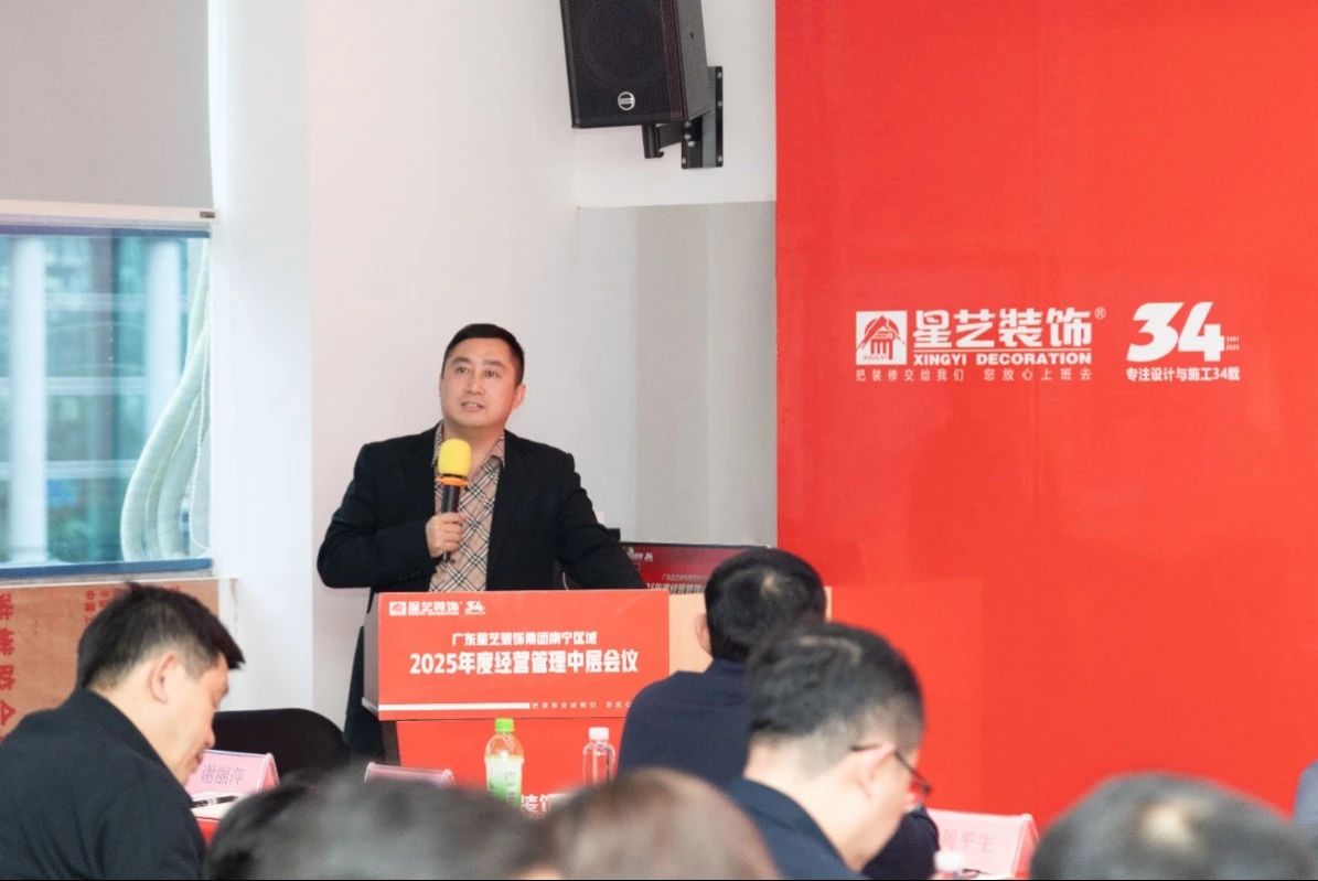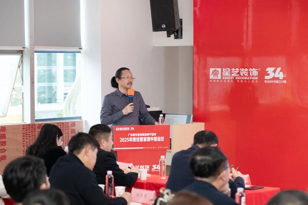會議開始,星藝南寧區(qū)域設(shè)計總監(jiān)李明先是總結(jié)2024年星藝南寧各大部門所取得的成績,并提出”優(yōu)化提效“、”精細(xì)化板塊“”客戶管理系統(tǒng)“等方面進(jìn)行致辭;星藝南寧區(qū)域副總經(jīng)理胡四民就”材料管理“、”人才培養(yǎng)“以及”大家居“等方面進(jìn)行解析。