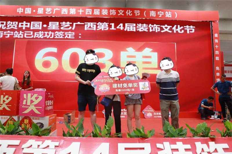 6月10日,星藝裝飾第十四屆裝飾文化節(jié)(南寧站)在會(huì)展中心圓滿落下帷幕,在廣大客戶和五十一家一線品牌聯(lián)盟建材商家、中行、建行、工行、民生銀行以及500多名星藝家人的努力下,本次活動(dòng)成功取得603單的佳績(jī),怒刷2017年第十三屆文化節(jié)的記錄,達(dá)到新的高度,碩果累累,收獲滿滿。